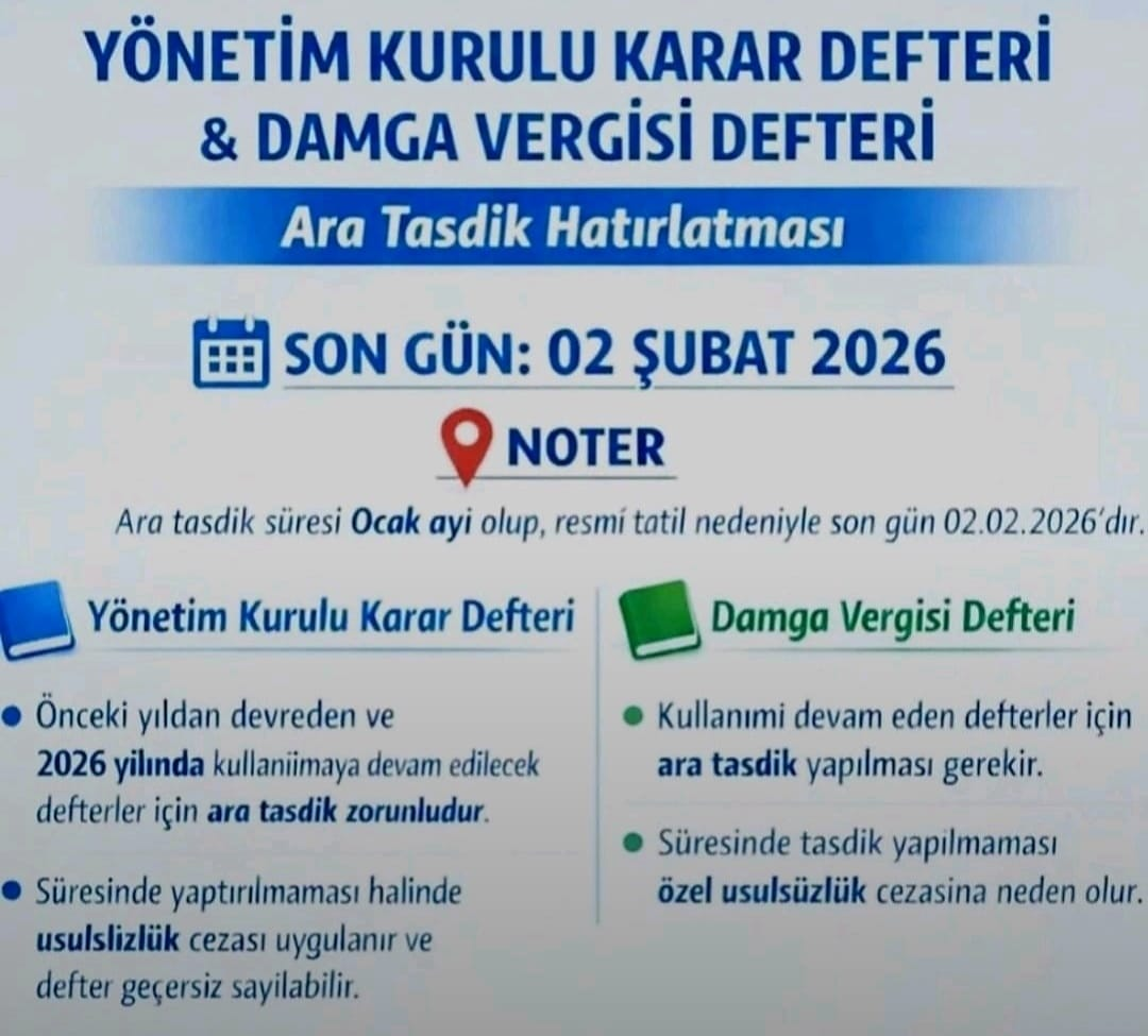 Önceki yıldan devreden ve 2026 yılında kullanılmaya devam edecek defterler için ara tasdik zorunludur.
